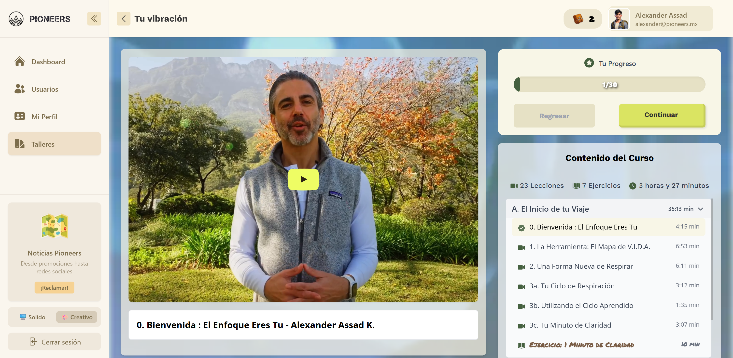 Se construyó la presencia oficial de Pioneers para comunicar la propuesta educativa de Alexander Assad y un campamento digital con rutas de aprendizaje, lecciones y ejercicios personalizados. La plataforma facilita inscripción, consumo de contenido y seguimiento del avance.